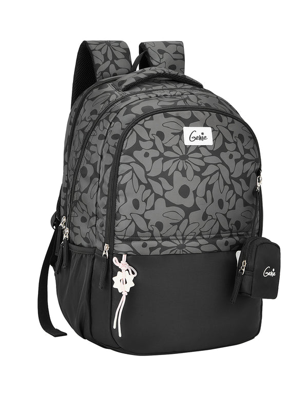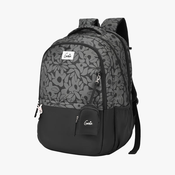Classic with a twist, Eleanor in black pairs a grey floral print on the top half with a playful pink zipper puller for a pop of contrast. This 19-inch girls laptop backpack includes three compartments, a padded laptop section, and an organiser pocket with pen loops. With a secret pocket, rain cover, and Happy Pouch, it’s both charming and practical — made for confident everyday use.